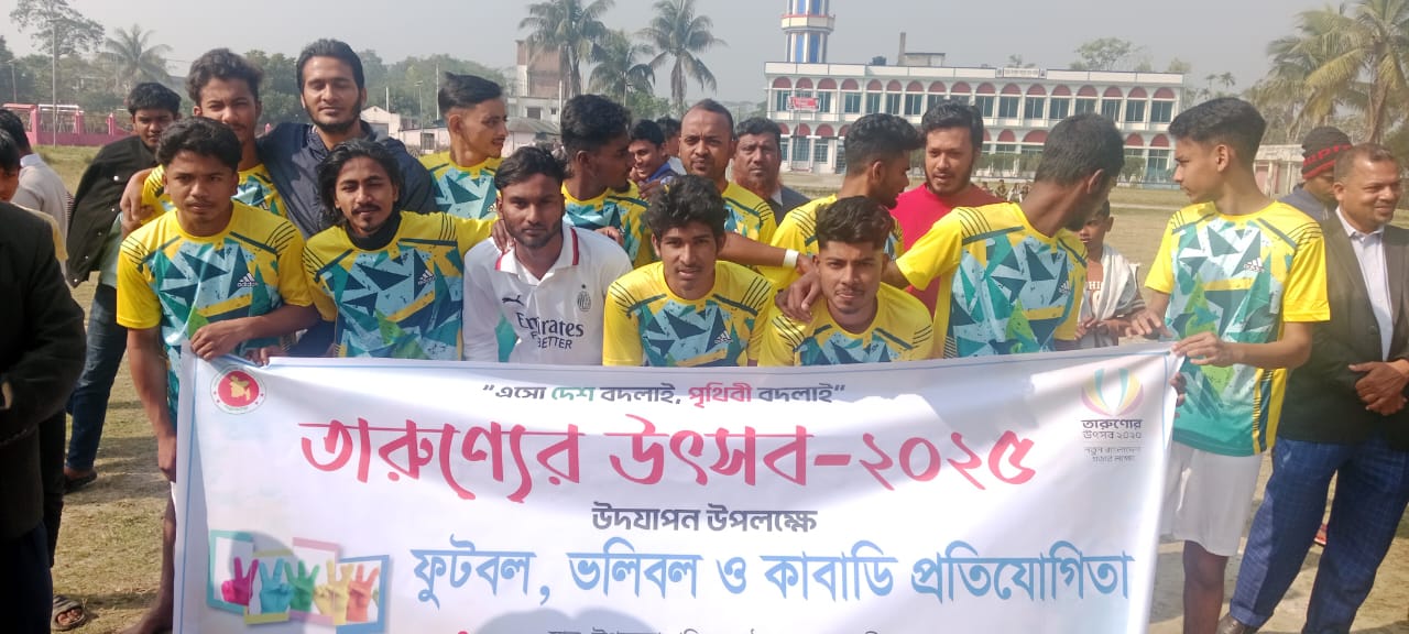 তারুণ্যের উৎসব ২০২৫ উপলক্ষে উপজেলা ভিত্তিক কাবাডি ও ভলিবল টুর্নামেন্টে অংশগ্রহন করে ডামুড্যা পৌরসভার জয়ী খেলোয়ারদের পুরস্কার গ্রহনের ছবি।